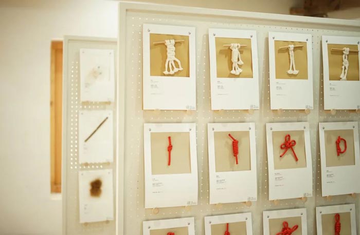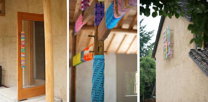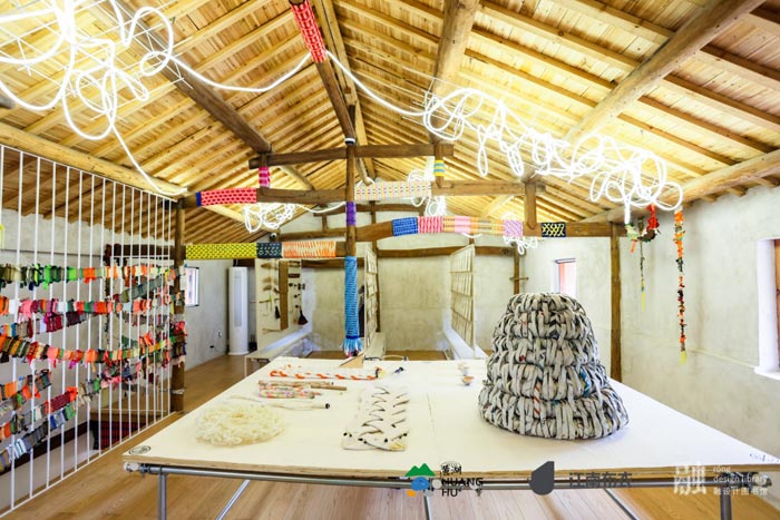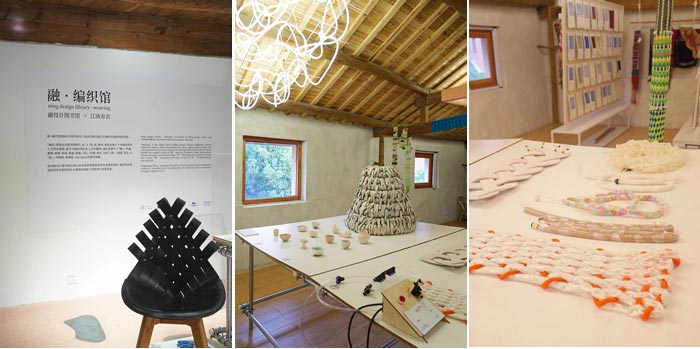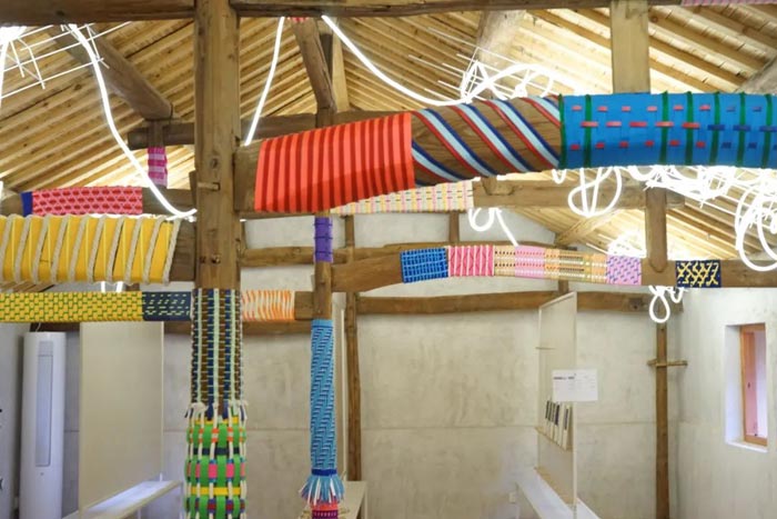 除此以外,與編織館房梁、支撐結構融為一體的編織元素,既是空間裝飾,同時也是編織作品。與房屋空間的編織是由品物流形 PINWU 和融設計圖書館創始人及設計總監 Jovana Zhang 使用設計工坊中剩余材料再設計,手工編織完成。