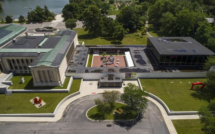 2019年博物館耗資1.6億美元進行擴建,重點就是藝術家和建筑師合作的《共同的天空》這件藝術作品。他們聯手在博物館中庭的上方創作了一件玻璃鏡面的漩渦雕塑作品,構成了弧形玻璃屋頂。屋頂由白色鋼材支撐,600塊重疊的鏡子和玻璃板構成了巨大的穹頂,屋頂與中庭地板有一個接觸點,并匯聚成漏斗狀,這里正是1962年種下的一棵樹所在的地方。漏斗形狀不僅強調了空間的不對稱性,還使最初被屋頂分開的內部和外部重新連接起來,在人造中庭與自然之間建立起聯系。這也意味著屋頂結構不需要在建筑物上強加新的支撐系統,并增加了動感,就像空心的樹干一樣,吸引雨、雪、樹葉、光線等外部元素落入其中。玻璃板以不同的角度進行排列而產生的光學效果,通過鏡面反光,既起到隔熱效果,也減少空調的使用。內部空間通過鏡面板產生復雜的、千變萬化的反射,當人們在下面的庭院中走動時,可以看到意想不到的景觀。