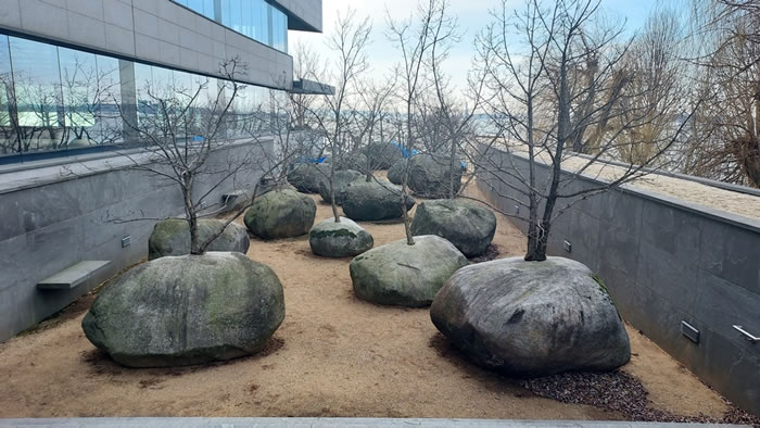 猶太遺產博物館于1997年開放,這件作品是受博物館委托制作的永久性作品,安裝在二樓的露臺上,從這里可以看到紐約港、埃利斯島和自由女神像。在猶太傳統中,人們會在墳墓上放置石頭作為紀念。在博物館里,戈茲沃西將石頭和樹木放在一起,代表相互交織的生命周期。這座花園是對那些經歷過大屠殺的人們的苦難和堅韌的紀念。時間對人類和自然的影響是高茲沃西作品中的重要主題,在《石頭花園》中同樣體現得很明顯,這些雕塑不僅是為了紀念死亡的前輩,也將被子孫后代的觀看、銘記和看顧。而在這個沉思的空間里,花園隨著時間的推移而成熟,呈現出新的體驗,從博物館的幾乎每個樓層都可以看到它?!妒^花園》至今仍然是曼哈頓下城游客的最愛。