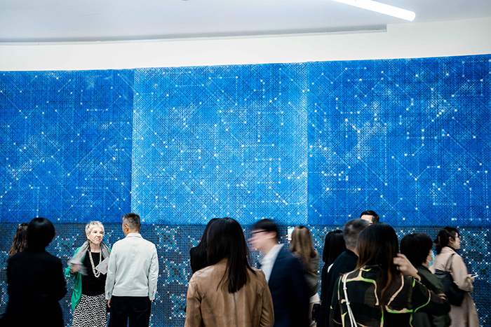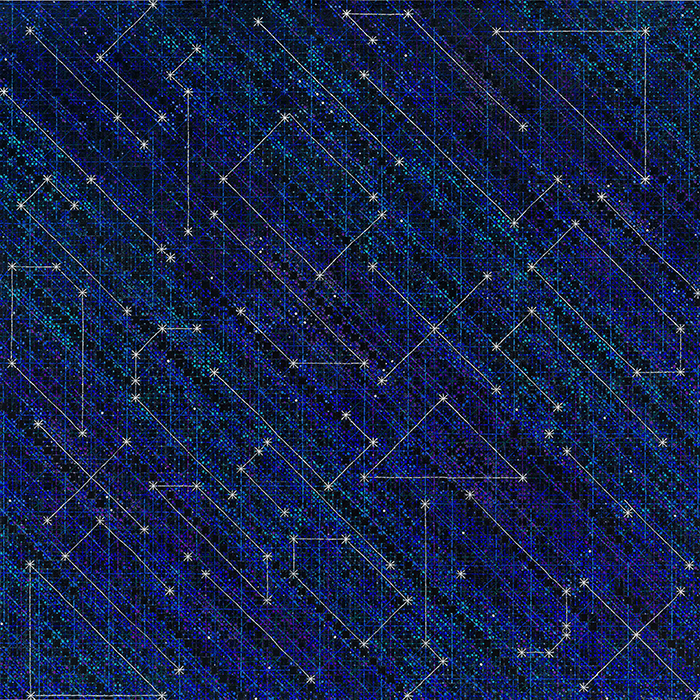 “星座與近作”聚焦丁乙在仰視視角之下關于精神性和宇宙星辰的探索,以及他為本次展覽和故鄉創作的全新作品“星座”系列。雖然丁乙的祖宅現已拆除,但是他猶記童年隨父從上海搭乘夜航船往返寧波的經歷。在深沉的夜里、顛簸的船內、漂泊的海上,他舉頭望見的是滿天星斗?;貞浿械蔫残菆D,躍現為新作品“星座”。新作中“?!钡囊庀蝾A示著丁乙駛向“內視”的新旅程,從一片海域航行至另一片海域,以尋求“十示”的無窮變量。
