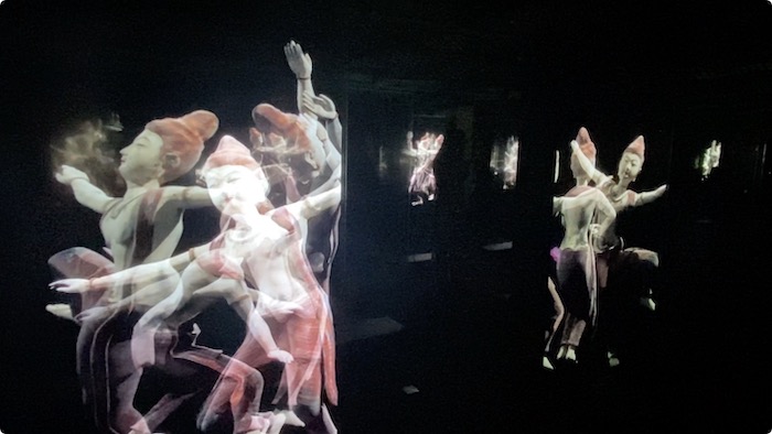 《天舞·離形》以敦煌佛教洞窟的靜態壁畫和雕刻人物樣式為基礎,將人物的肢體形態轉化為空靈的動畫,演繹了唐代佛經文本對樂舞的隱喻性描述。這些經文把舞者比喻成風中的火焰、香氣或流云,把仙舞者形容為非物質的、超感官的、象征著佛教的“無形之身”的超然狀態。作品展示了一個新的空間,介于可視與不可視,草木泥石與有情眾生,形與神的相互轉換,將傳統固定的三維物理空間,轉化為以流變為主線的多維時空。