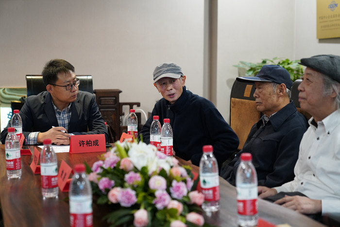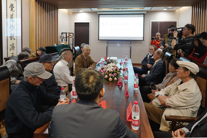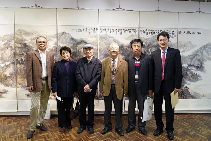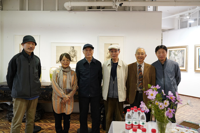 徐悲鴻紀念館館長、中國人民大學徐悲鴻藝術研究院院長徐慶平在藝術家吳運鴻陪同下觀看展覽