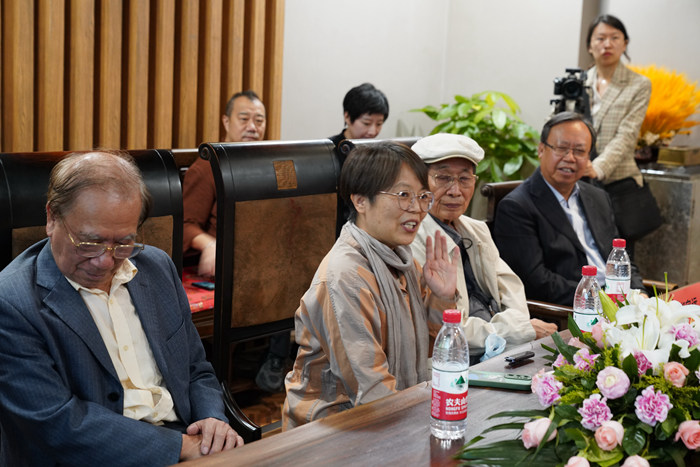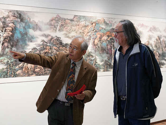 中國國家畫院研究員邢少臣、藝術家吳運鴻在展覽現場交流