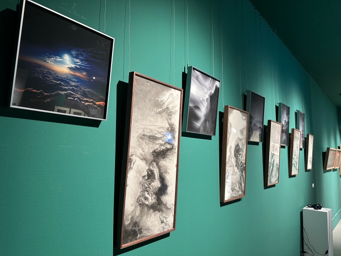 除了傳統書畫創作之外,青年藝術家邵若栩利用AI將詩句生成圖像,并對AI生成的圖像進行“寫生”,通過反復的對話讓圖像不斷發生連鎖反應與循環。創作了一系列書畫與AI對話的當代藝術作品,將唐詩與科技連結,繪寫唐詩的多維形態,展現藝術創作的無限可能。