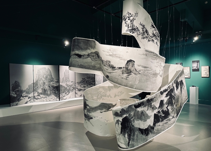 在最后一個展廳中,一件高高懸起,盤旋而落的30米長卷作品尤為搶眼。這件作品全長100米,由中國美術學院劉海勇教授帶隊的敦煌行走藝術家團隊在沙漠中共同創作完成,墨色中依稀可見五色敦煌沙礫附著其上。此次展覽展出了其中精選的30米畫面,這中有奇峻的三危山、平遠的黑戈壁、搖曳在風沙中的樹木植被、流淌在世人心中的邊塞文明……