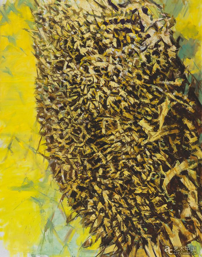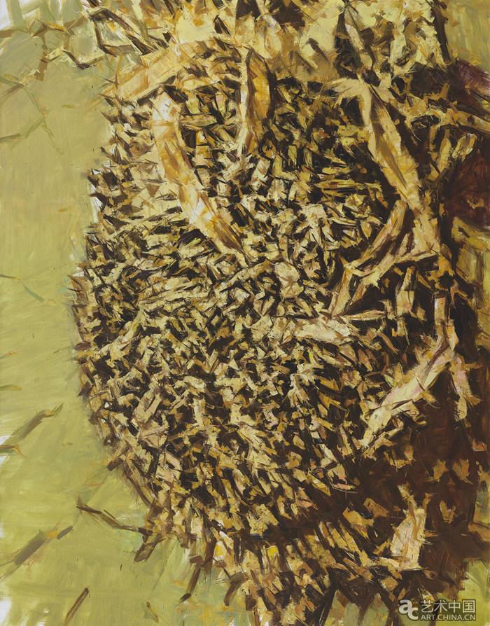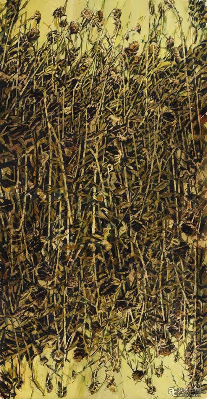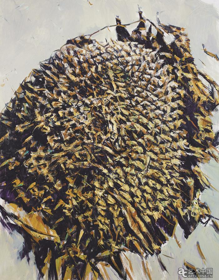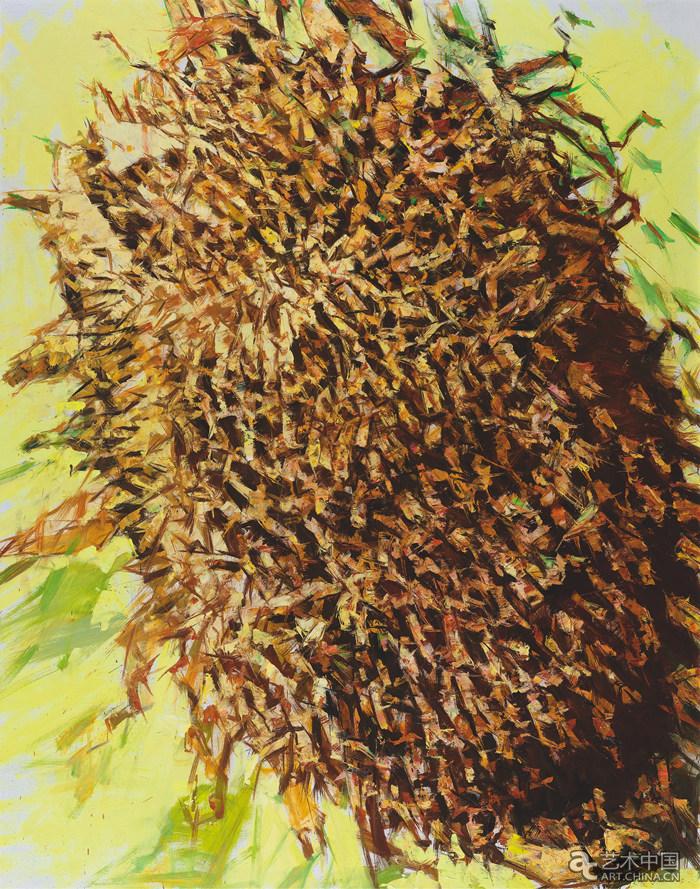 許江筆下的葵總是成片出現。即使是獨立的葵頭,也多以成組的形式展出。群葵簇擁,聚成排山倒海的氣勢。