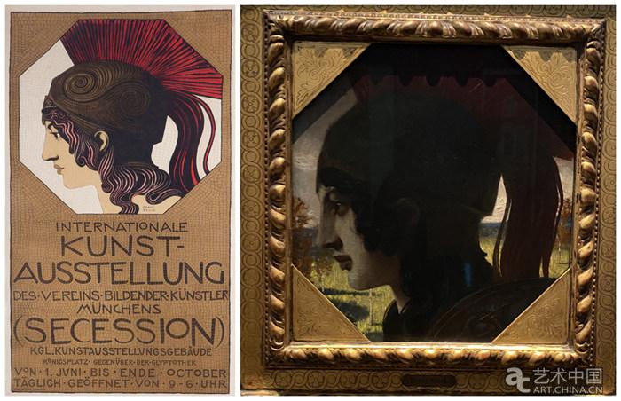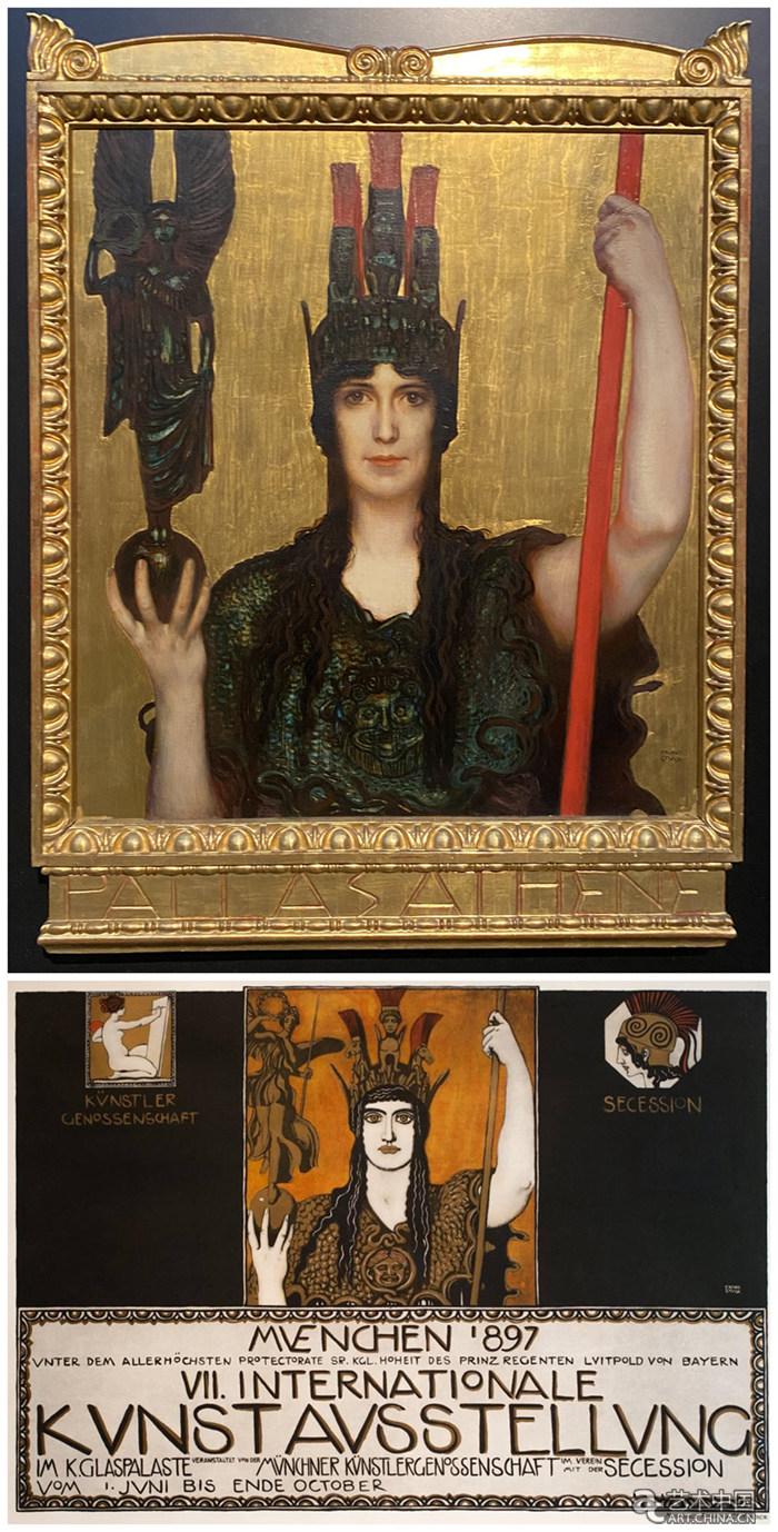 弗朗茨·馮·施圖克 右圖:《女神雅典娜》,1891年,藏于德國科隆瓦爾拉夫-里夏茨博物館;左圖:第一屆慕尼黑分離派群展海報(1893年),藏于德國慕尼黑施圖克故居博物館