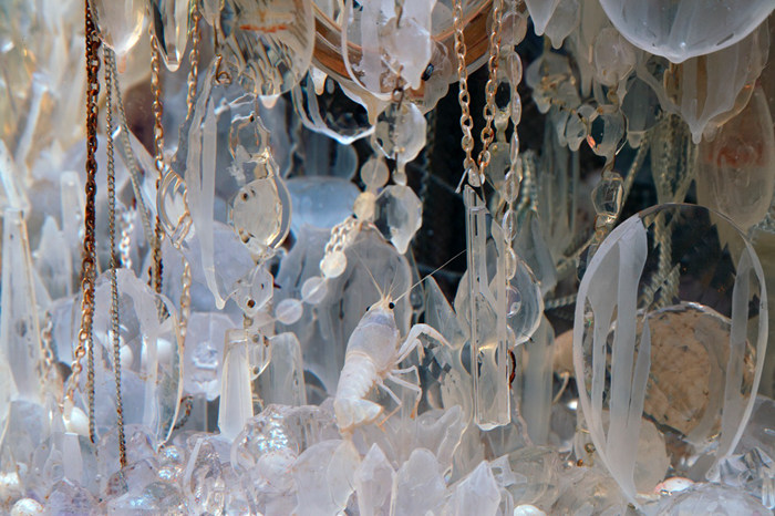 麥克斯·霍珀·施奈德,《重新歸類的度假勝地》,2017,活淡水生物群落、玻璃水族館、模擬棲息地、場域特定材料、中古和/或殘缺枝形吊燈及水晶裝飾品、鋼底座, 61.0 x 137.2 x 50.8 cm。圖片由藝術家提供。
