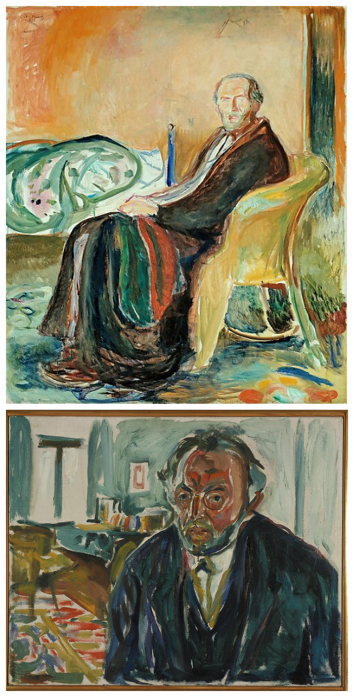 愛德華·蒙克,1919,上圖:《流感時期自畫像》,藏于奧斯陸國立美術博物館;下圖:《流感后自畫像》,藏于奧斯陸蒙克美術館