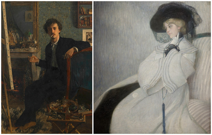 左圖:《壁爐旁的自畫像》,約翰·維克托·克拉默,1889,藏于維也納博物館;右圖:《黑與白》,威廉·李斯特,1904,藏于維也納博物館,曾展出于維也納分離派群展(1905)