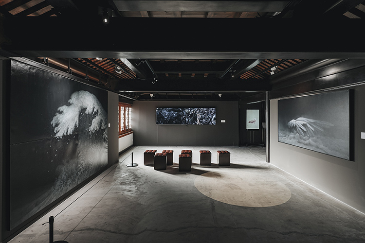 展覽是一次多元媒介的通感體驗。在觀展動線上,將國畫、油畫、雕塑、數字攝影、裝置、影像、加密藝術和虛擬現實等不同媒介以及在不同時空框架中呈現的作品并置,形成多組對話關系,令觀眾仿佛置身于由傳說中異獸的暢想和宇宙中生命的探尋共同構建的時空交錯的想象世界中。通過預先訓練而成的人工智能模型,將觀眾在觀展時只能對于作品單向接收的感知方式轉化為聽覺互動,為每一件作品都帶來獨一無二且相互聯覺的多重感知體驗。