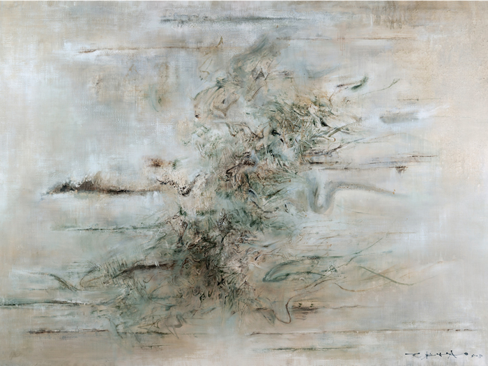 趙無極欣賞的唐宋山水繪畫是建立在天人合一宏觀視角下的自然觀,和建立在主客觀分離的單一視角的繪畫傳統西方風景畫截然不同,正如趙無極自己所說:“我畫的是自然,而不是風景?!彼浾f:“我很欣賞米芾對空間的安排和倪云林對松處的處理,中國畫里虛實造成的節奏,一個推一個的不斷移動,使畫面輕重有致,這是中國山水畫和西方油畫不同的地方。"他將傳統藝術中動勢、輕重、韻律和空間關系規律應用在畫中,將油彩滲入更多的松節油,在畫布中渲染、揮灑,氤氳空靈,若輕若重,大面積留白,畫面氣象更趨空靈、流動、平靜。