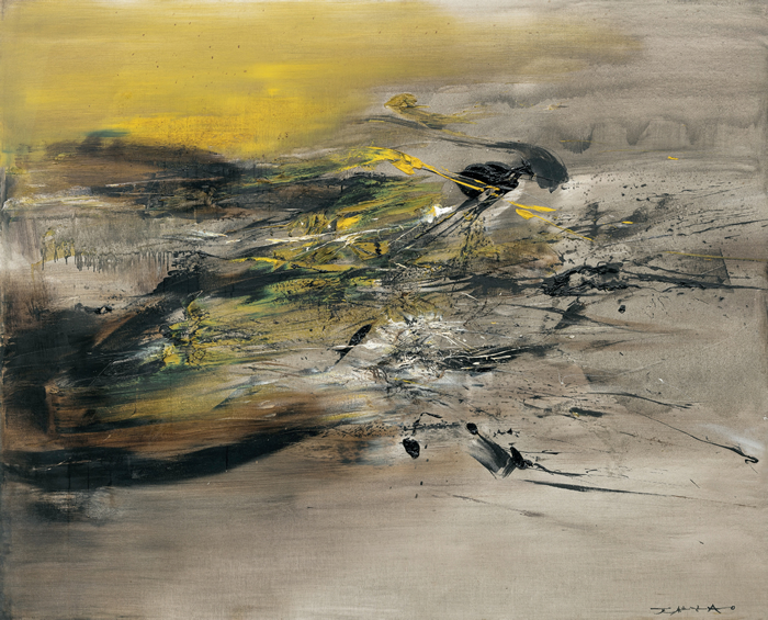 趙無極對傳統的吸收與抽象藝術恪守的原則做了平衡,趙無極對傳統的借鑒建立在更高維度的層次上。在他的畫中,他不描摹任何自然具象事物和文化圖式,用繪畫語言和形式因素進行純粹的繪畫,他對傳統書法和山水的吸收是取意不取形,他的畫面是Art Informel,明暗色域沒有固定化的構圖和模式,變化萬千,畫面中能看到斑駁破碎的筆觸線痕,模糊消融的大團色塊,但看不到任何書法的具體筆觸和山川海洋的形貌。另一方面在相當長的時間里,他只按標號給作品命名,就是不希望文學化的敘事限制作品意義的開放性。正如趙無極自己所言:“我想要畫看不見的東西,生命的呼吸,風,移動,生命的形式,色彩的迸發和融合?!?/p>