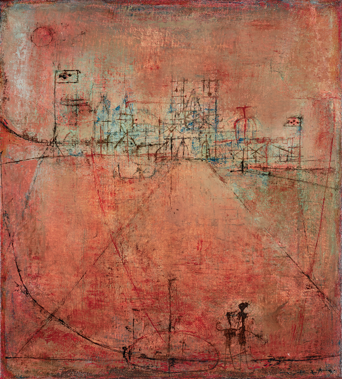 他當時以中國甲骨文、鐘鼎文符號和極簡的線條造型中去營造畫面,在這一時期,神秘的符號和隱秘虛空的背景已經初具規模。到五十年代中期,抽象符號進一步消融在詩意的時空之中,這時他的作品已經離抽象藝術非常接近。