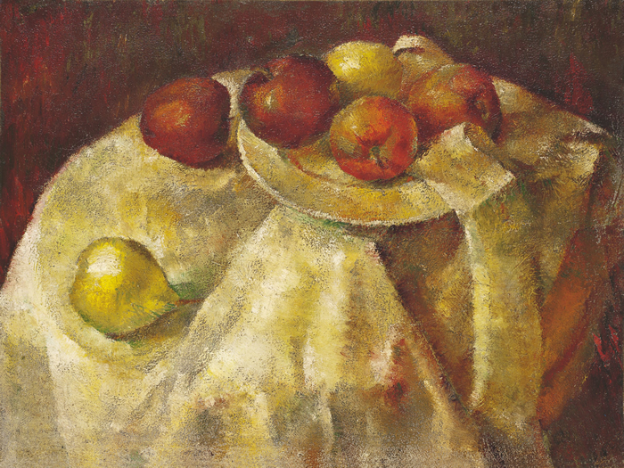 《無題(有蘋果的靜物)》(Sans titre [Nature morte aux pommes]),1935-1936年,布面油畫,46 × 61 cm,攝影:Antoine Mercier? 趙無極 - ProLitteris,蘇黎世