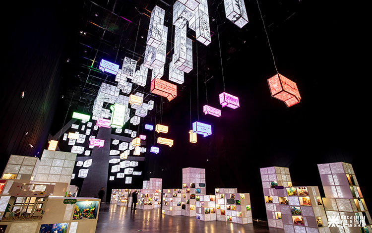 2號展廳的大型裝置作品《折疊城市》,是由銀川當代美術館構思策劃,銀川實驗二小教育集團、藝術培訓機構及來自社會征集的作品共同參與、共同創造而成,通過手工制作的盒子展示了孩子們對日常生活觀察的獨特詮釋和想象力的具象呈現。這些小小的盒子串聯起了一個個生動的故事,構成了一個立體的“城市”,孩子們的創作不僅是對自我的表達,更是分享他們內心聲音的方式。通過展覽,我們可以透過孩子們的眼睛窺視未來的可能性,鼓勵所有兒童勇敢地表達自己。深入了解他們的世界,關注他們的思維、疑惑和感受,或許能喚醒我們內心深處的純真和夢想。我們誠邀觀眾一同步入這個由創意與夢想構建的“城市”,聆聽未來的聲音,重新找回被遺忘的純真。在本次展覽中,參差錯落的城市空間不但承載了小藝術家們紛繁的想象力, HUAWEI MatePad和智慧屏作為本次藝術展的科技亮點,以其出色的黑科技性能和超強的創作力展現了科技與藝術的完美交互,更是打造了與游客互動的嶄新方式,讓科技感、互動性、趣味性成為該作品的亮點之一,在大朋友、小朋友們在與作品的實時互動中,以關鍵詞的方式立體感受孩子們創造力和想象力。