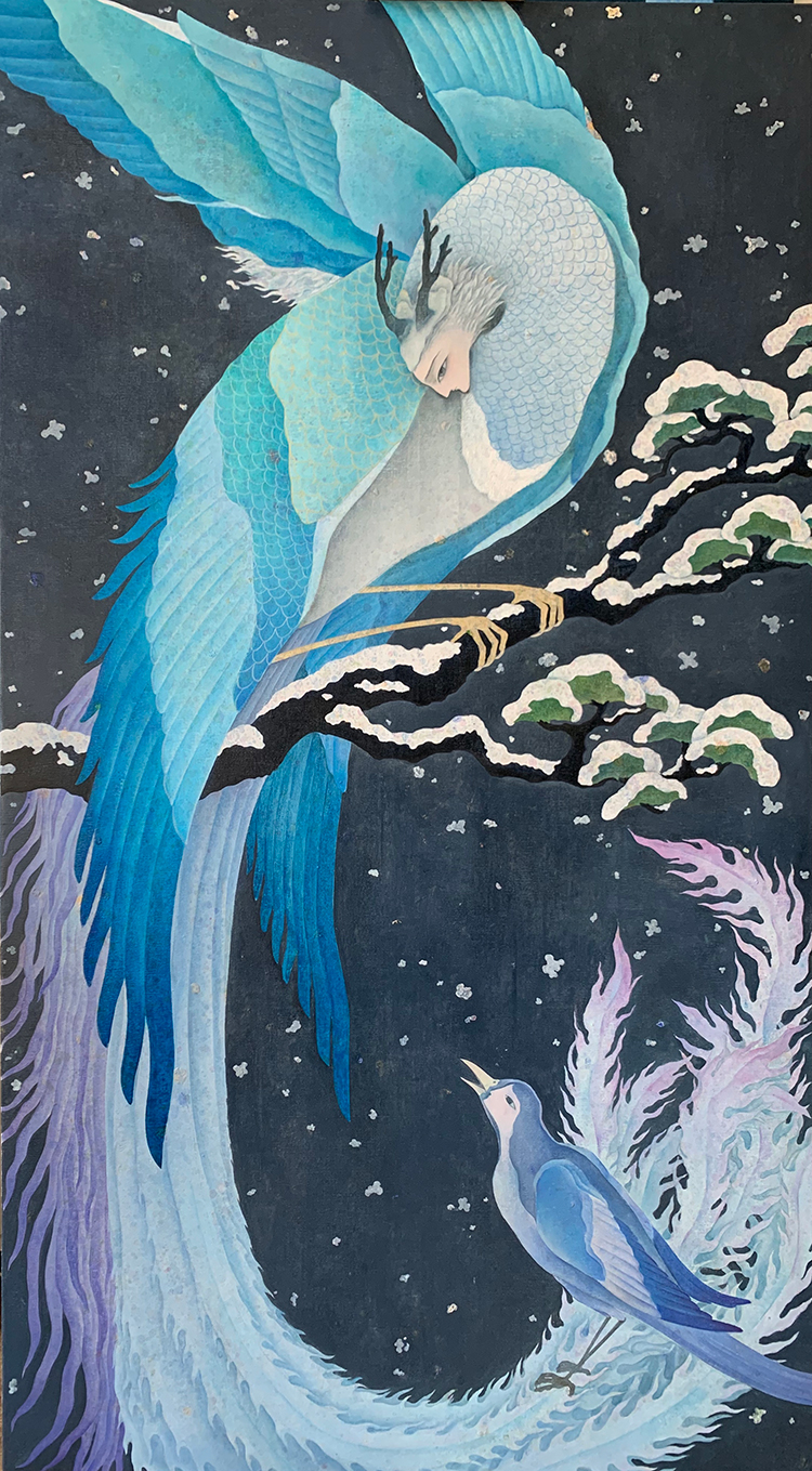現實世界里的諸多問題在這里也被轉換成另一種觀看和解析的視角,年輕的藝術家馮寶龍、唐琪、王若伊、劉鈺飛將他們對于現實世界的觀察,關于時間、生命的感知通過個人化的方式呈現,在他們的作品中,我們找到了一種獨特的自然狀態,讓人仿佛回到了最純粹的自然之中?;ú?、蟲魚、鳥獸在他們的作品中化身成了另一種神秘的擬人形態,展現了宇宙萬物中無與倫比的神奇。