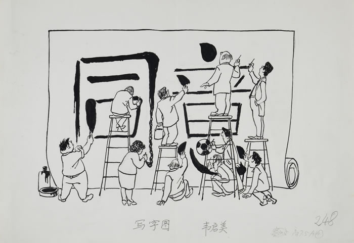 《寫字圖》,紙本、墨水、毛筆,30.6×44.1cm,1998年,發表于《人民日報》增刊《諷刺與幽默》,1998年4月20日第8期