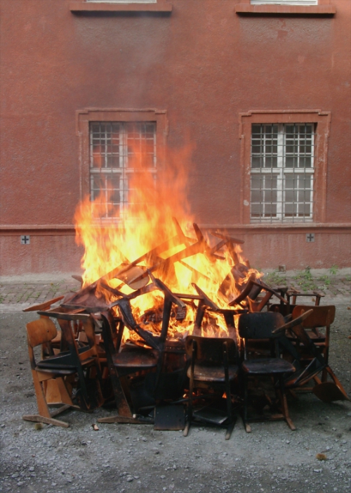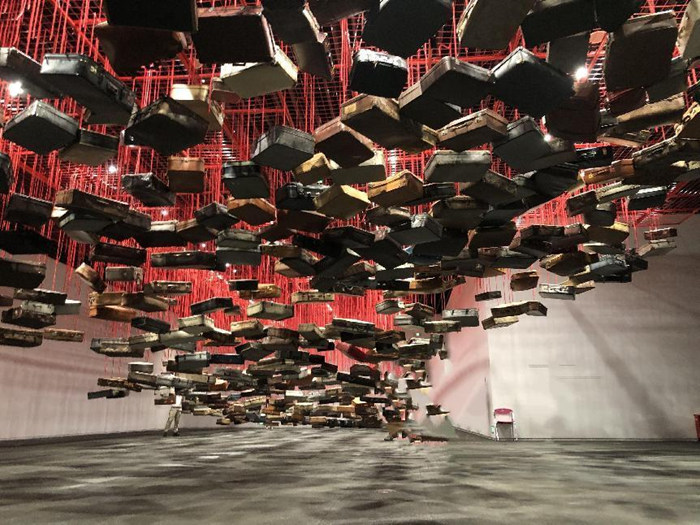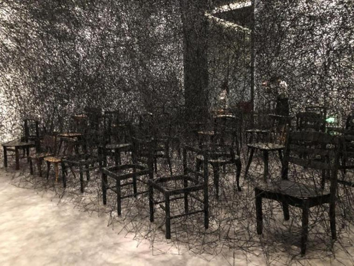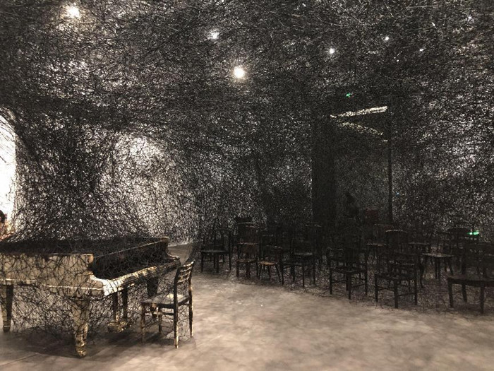 行進至深圳美術館展廳深處,是另一番景象:互相纏結交織在一起的紅線換成了漆黑的顏色。它們編織成一張巨大的網,裹住60把焦黑的椅子和一張燒焦的鋼琴。