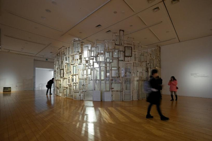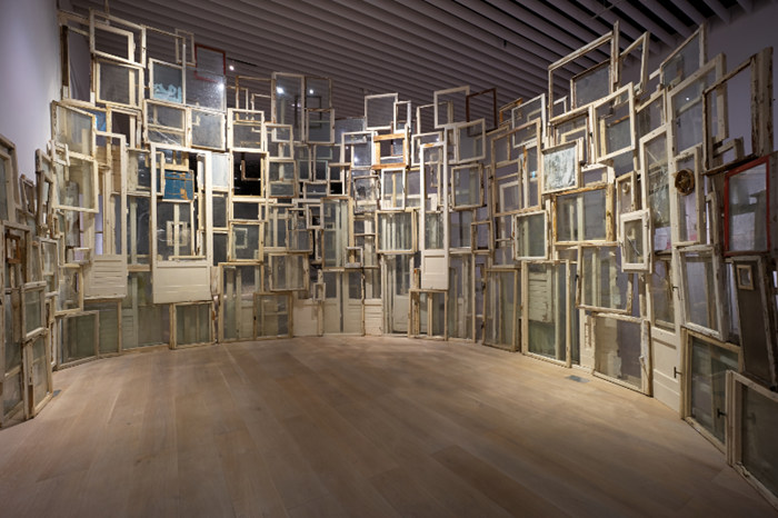 內與外,2019,舊木窗,“鹽田千春:顫動的靈魂”展覽現場圖,森美術館,攝影:Sunhi Mang 圖源:鹽田千春官網(www.chiharu-shiota.com)
