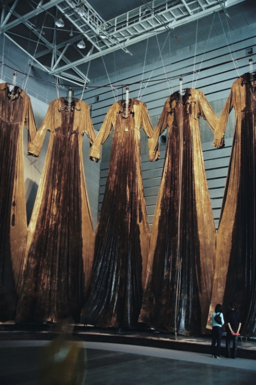 22件泥水浸染的巨型連衣裙,由細線引領自高高的屋頂緩緩垂落,整齊排列于展廳之中,靜謐而凄涼,流露出一股莊嚴的儀式感。泥濘的“切膚之痛”突顯了藝術家內心的焦慮與憂慮。