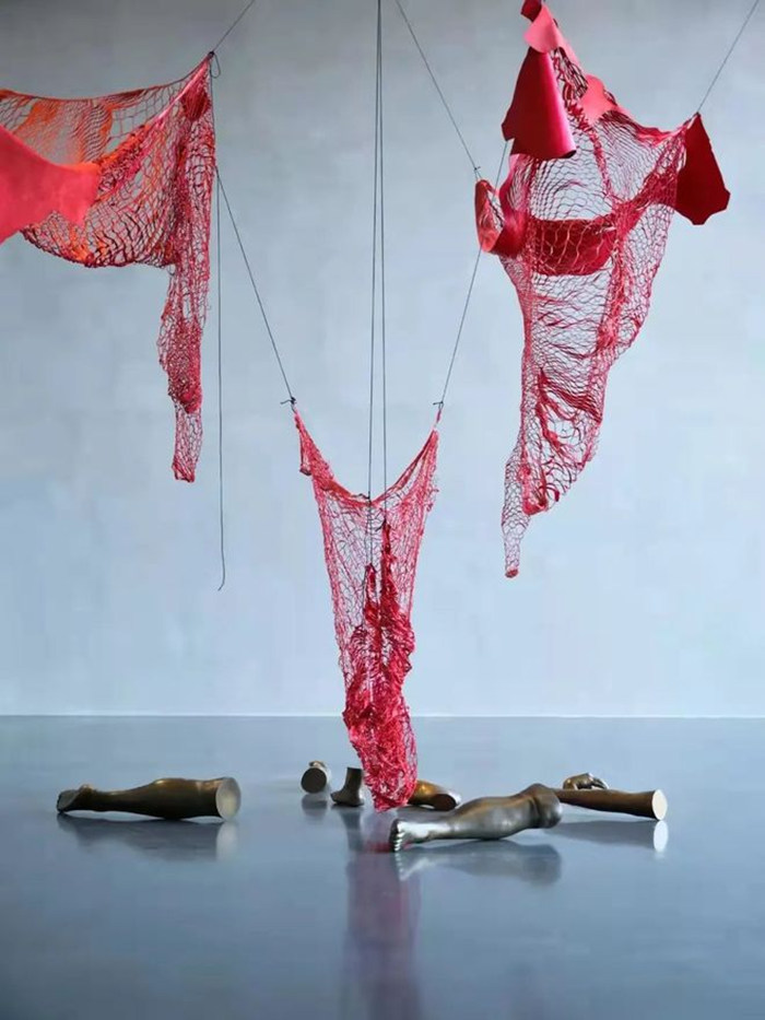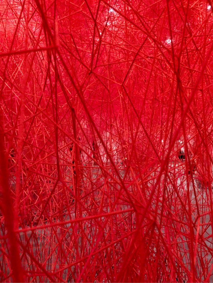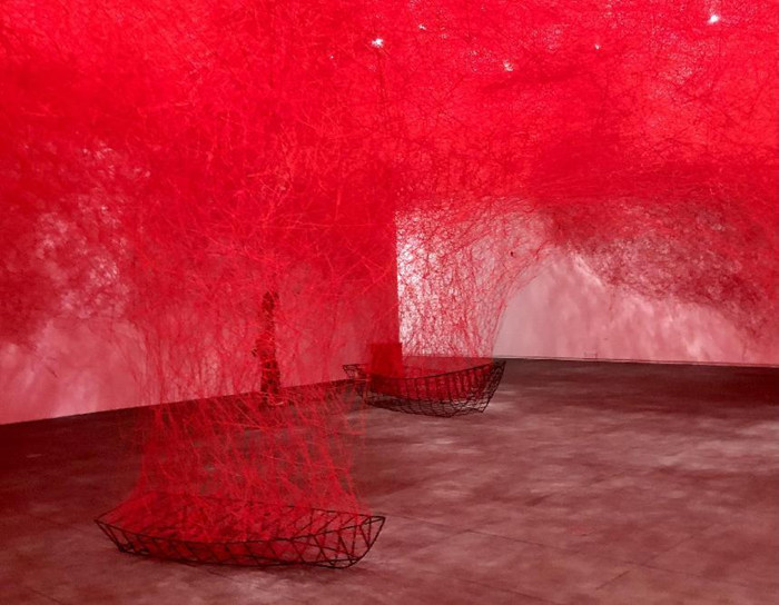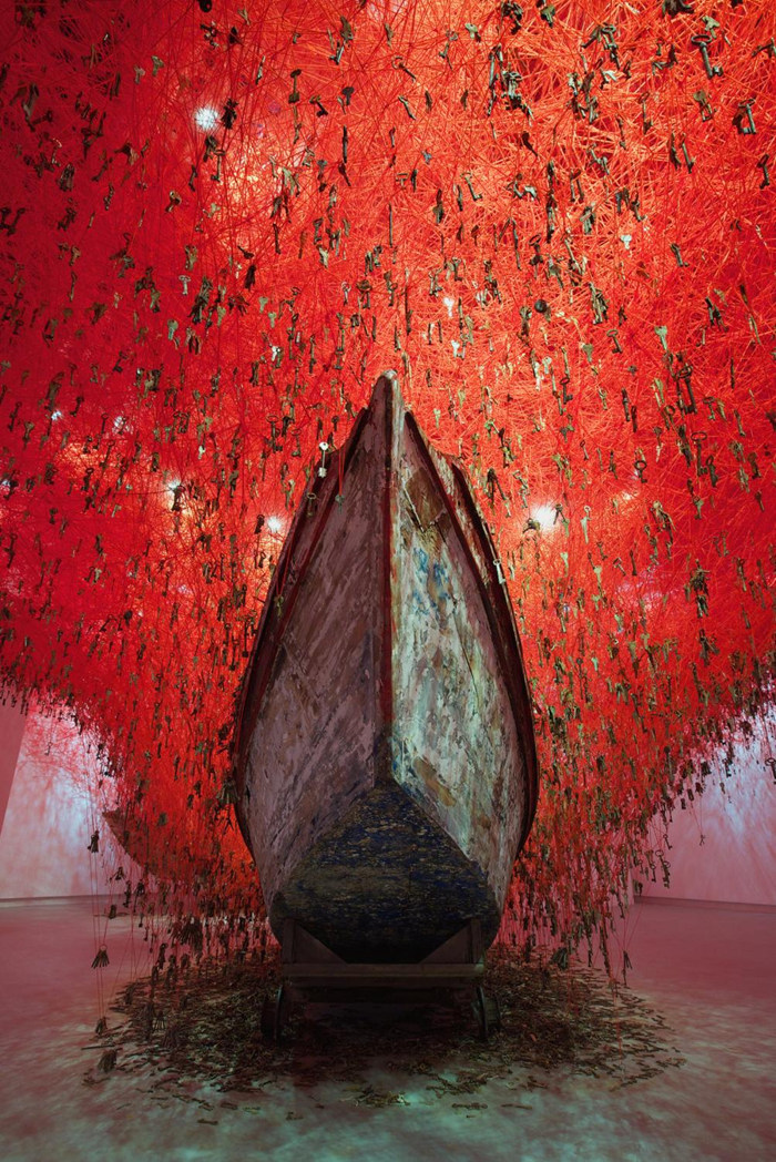 紅色的棉線揭示了血脈和生命錯綜的關系,編織成彌漫整個大廳的網絡,這些紅色血絲的映襯,突顯了生命與回憶之間的聯系。這網絡如同鮮血般的色彩,象征著連接,而船則成了漂泊之旅的象征。身體、生命和個體身份的不確定性成為鹽田個人風格的最突出表達。