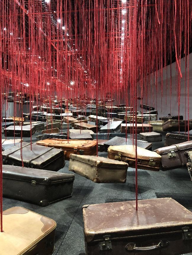 這些懸掛在半空中的、微微顫動的行李箱,呈現了一個緩慢升上天空的軌跡,表現了一個時間切片下不確定的空間歸屬。在她的觀念中,行李箱成為了一種象征,一種代表個體追尋歸宿卻最終無法逃脫命運的狀態。這些箱子承載著無數個故事,它們所體現的死亡和不可擺脫的宿命,代表了使用過這些箱子的人在無法找到屬于自己的歸宿中走向死亡。