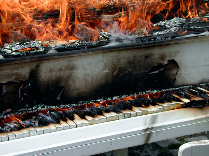 焚燒是她的早期作品中最頻繁出現的場景之一?!鹅o默無聲》的創作源泉根植于童年的創傷和那些難以磨滅的記憶。她目睹了鄰居家的一場火災,大火中鋼琴燃燒的聲音,成為了一段記憶中無法抹去的經歷。多年之后,她試圖將這段難以抹滅的樂音,以視覺化的方式展現在作品中。鋼琴四周纏繞著密密麻麻的黑線,形成了一張由記憶編織而成的網,在這片寂靜之中,被焚毀的鋼琴仿佛在奏響一曲無聲的奏鳴曲。