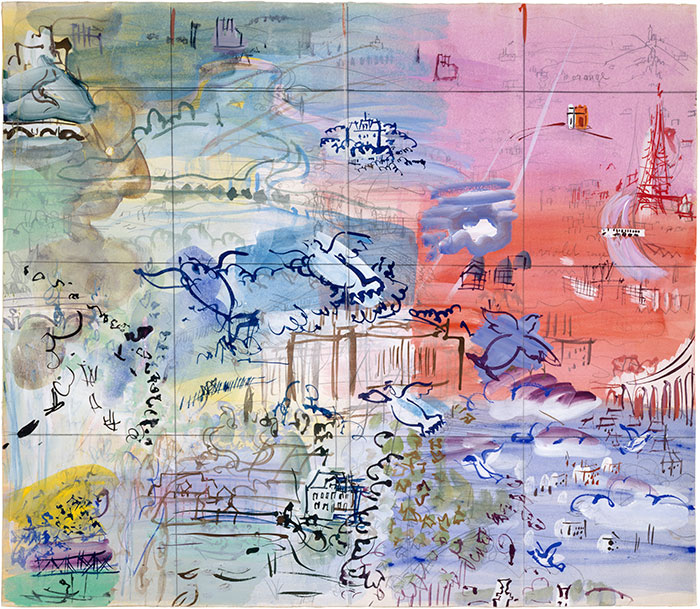 拉烏爾·杜菲的另一點出眾之處在于,他用自己的作品記錄了那個時代的許多重大事件,對技術進步的各種表現形式也極為熱衷。大展“拉烏爾·杜菲:快樂的旋律”將徐徐展開一幅生動的20世紀上半葉生活畫卷:儀式典禮,運動賽事、現代化機器、外科手術、摩天大樓、濱海風光、賽馬、旅行、音樂、飲食起居、名流肖像……正如策展人克里斯蒂安·布萊昂所指出的:“從許多角度來說,他都可以被認為19世紀法國詩人夏爾·波德萊爾所稱的‘現代生活畫家’”;“這些對時事的描繪堪比新聞報道,讓我們看到,杜菲似乎想要將現代人的所有活動都囊括進自己的作品中,并同時宣示自己對人類不斷進步發展的信念。他創作的作品顯示出一種現代性,而他理解和展現這個不斷演變的世界的方式也同樣如此?!?/p>