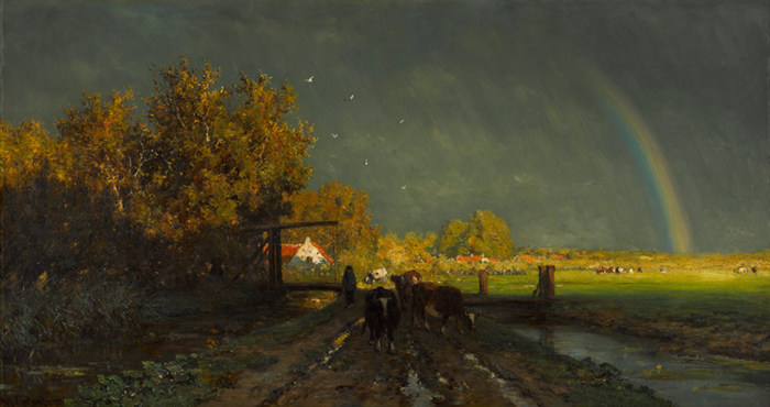 本著巴比松畫派的精神,活躍于1860年代至1900年代的海牙畫派專注于自然光線和氛圍,擅于描繪未受破壞的自然場景,風起云涌、綠水圩田、牛群遍地是海牙畫派偏愛的典型主題。其中,威廉·魯洛夫斯定格下了一個戲劇張力十足的彩虹即景,這樣的敘事元素在當時的荷蘭繪畫中極為罕見。