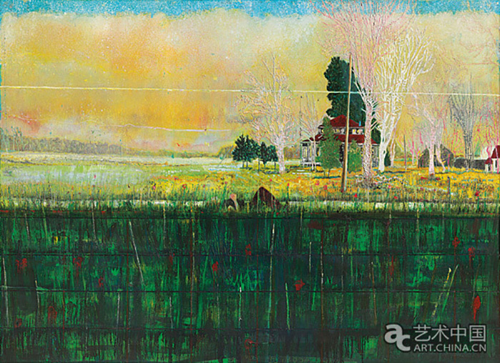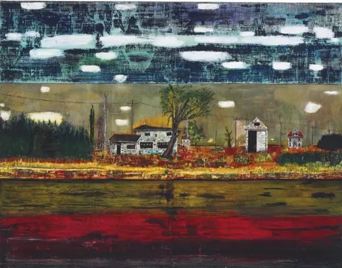 多伊格保留了他在倫敦的舊工作室,里面有一張很長的、未使用過的畫布,是他用縫合在一起的郵袋制作的?!坝幸惶?,我剛剛開始畫一幅風景畫,以一種我以前從未在畫布上做過的方式——非常松散且流動,所以油漆會滴落到一些地方?!彼f:“這就是我在蒙特利爾拍攝電影時畫畫的方式。我很清楚我指的是哪一段路,就是連接蒙特利爾和多倫多的401高速公路?!边@幅畫被劃分為三個水平空間,從那以后他一次又一次地使用這種方式。