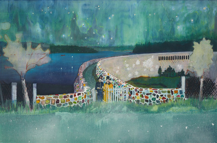 《Gasthof》是多伊格早期重要作品,畫中有兩個精心打扮的奇怪人物,頭戴三角帽的男子像是拿破侖士兵;另一個身穿長袍的人像是奧斯曼帝國的官員。星星點點的夜空倒映在湖泊中,觀眾好像正在觀看即將開始表演的舞臺一樣。