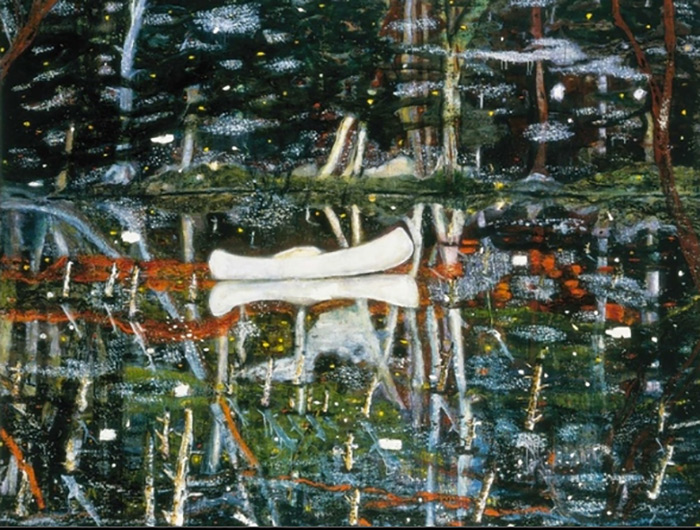1987年的一個晚上,多伊格從谷倉回來,看到了他妹妹索菲正在看的一部電影的錄像帶。那是肖恩?坎寧安的邪教恐怖片《十三號星期五》,他看到的是謀殺案發生后的場景,一個驚恐的年輕女孩,獨自在湖上乘獨木舟逃脫。這個圖像讓多伊格想起愛德華?蒙克栩栩如生的畫作。他被這個美麗而怪異的場景所震驚,當晚他回到谷倉,開始畫畫。