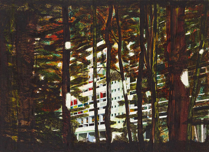 《搭便車的人》也讓他萌生了將自己在加拿大的經歷運用到工作中的想法?!拔彝蝗挥辛艘粋€以前沒有過的話題,”他說。加拿大對他來說一直顯得熟悉而平凡,但現在,在倫敦,一切變得令人興奮。在切爾西期間以及接下來的幾年里,多伊格畫了他所謂的“溫馨”郊區房屋、結冰的池塘、滑雪場和開闊的田野。這些早期畫作中的房屋看起來無人居住且荒涼,你可以透過樹林或灌木叢看到它們,或者被飄落的雪花模糊。(他接著畫了建筑師設計的房屋,包括勒?柯布西耶在法國布里耶恩福萊的住宅單元,半隱藏在樹屏后面。)他畫的是那些你必須努力才能看到的空間。