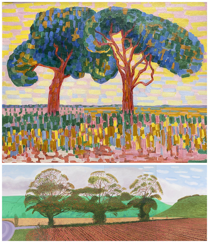 上圖:《兩棵樹》(Two Trees),雅格巴·凡·希姆斯凱克(Jacoba van Heemskerck,1876-1923),1910,荷蘭海牙美術館藏品(Kunstmuseum Den Haag);下圖*:《蒂克森代爾的三棵樹(秋景)》(Three Trees near Thixendale-Autumn),大衛·霍克尼(David Hockney,1937年7月9日-),2007-2008,?伍爾特收藏(Würth Collection / Sammlung Würth)