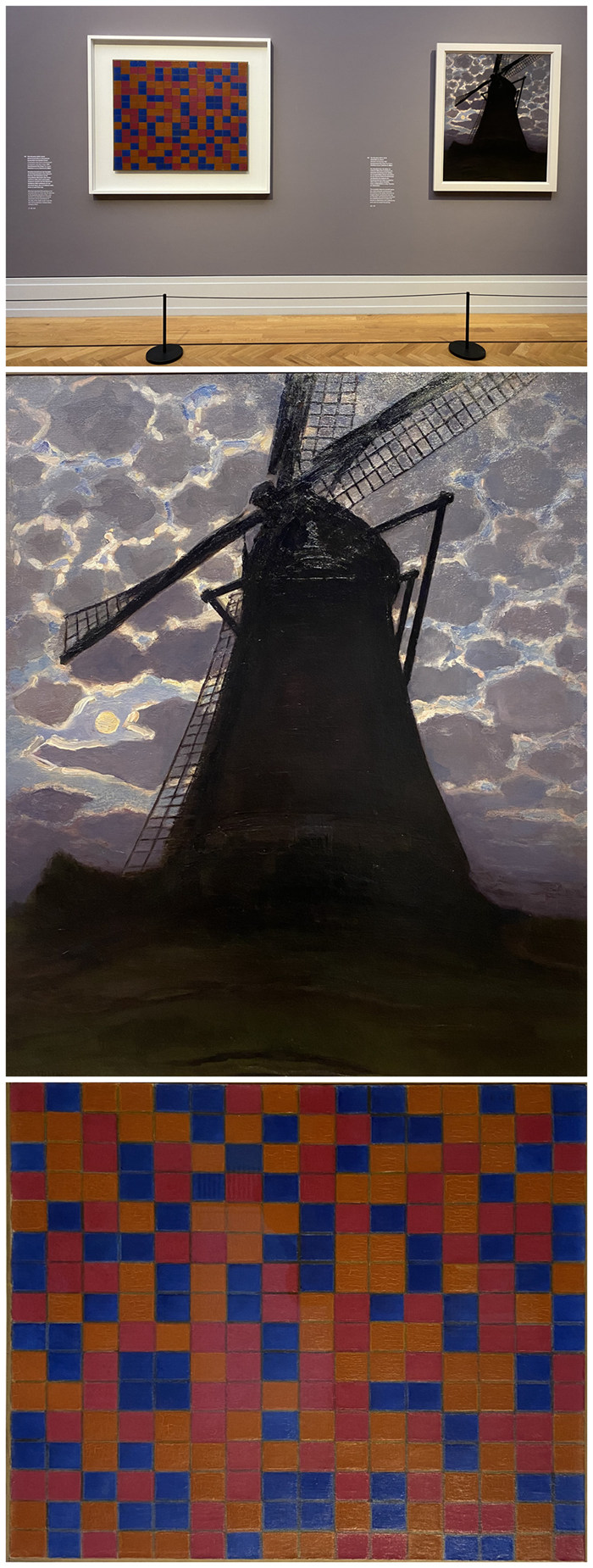 皮特·蒙德里安(Piet Mondrian,1872-1944),荷蘭海牙美術館藏品(Kunstmuseum Den Haag),中圖:《夜風車》(Windmill in the Evening),1917;下圖:《網格8的組成》(Composition with Grid 8 ),1919