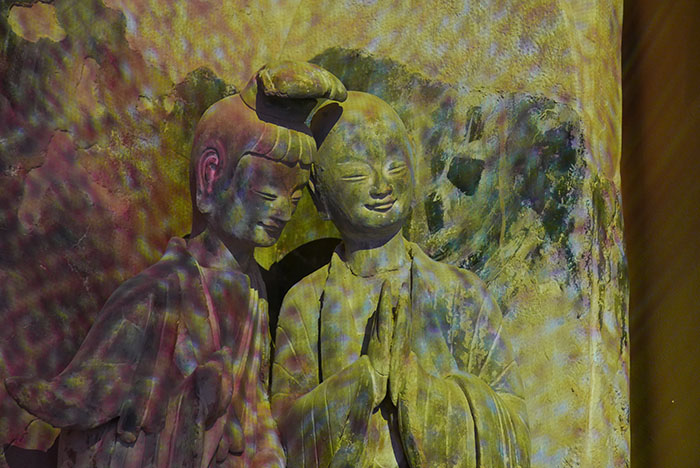 作品創意源于麥積山石窟。麥積山石窟的窟龕絕大多數開鑿于絕壁之上,棧道凌空飛架,造像以泥塑最具特色。作品結合麥積山特有的景觀紋理,三面墻壁布滿象征棧道的線條,壁面間嵌入第 121窟菩薩與弟子“竊竊私語”塑像。麥積煙雨,絲路金光,光影交錯幻化出微笑的佛影,散發出極致的東方神韻。