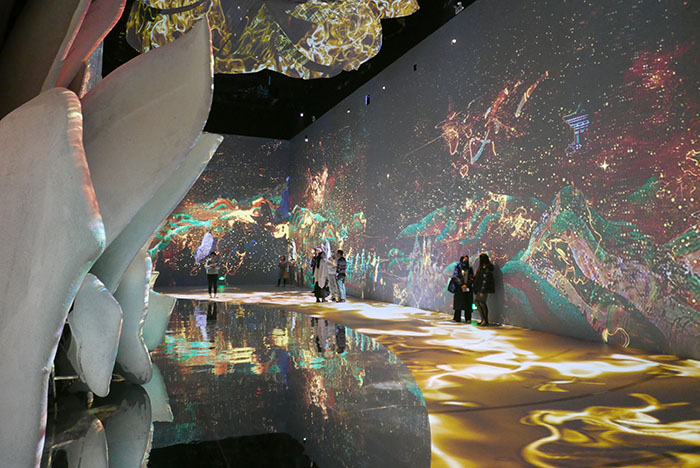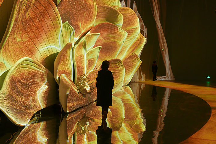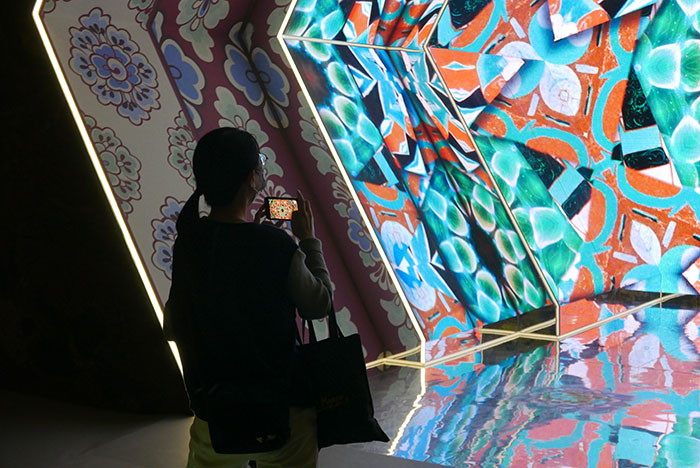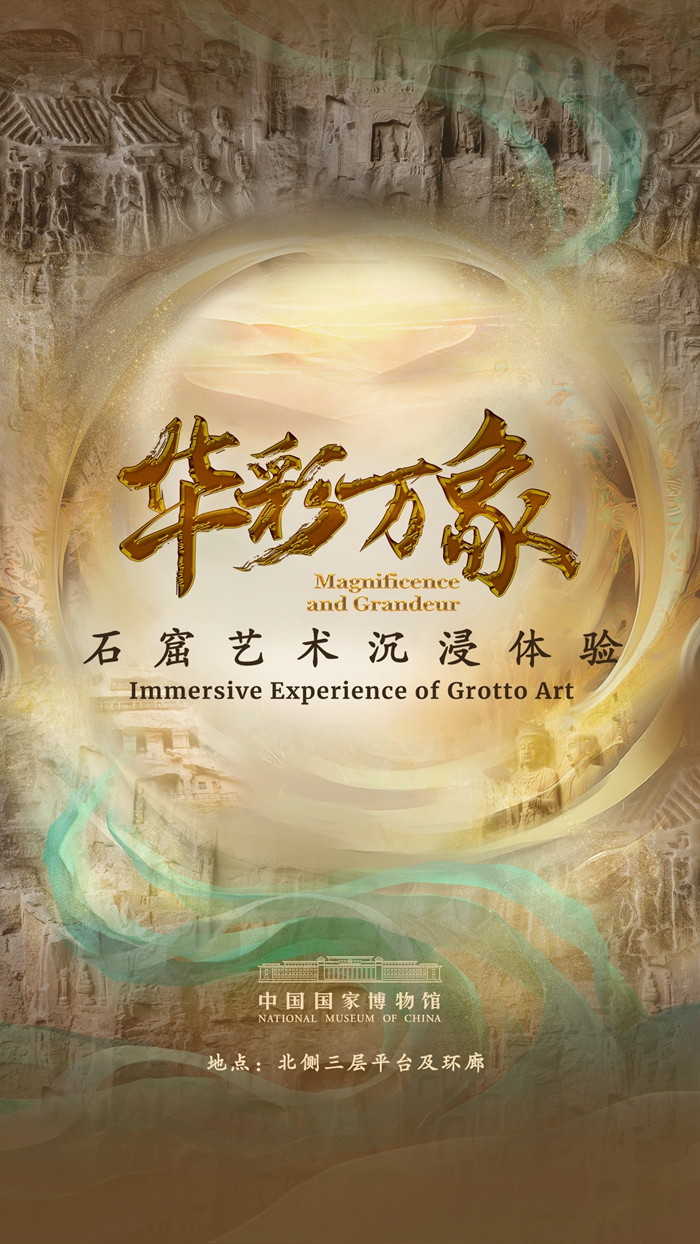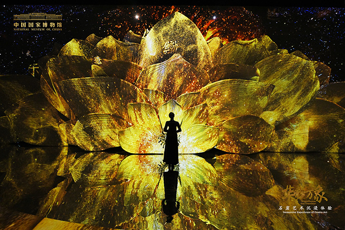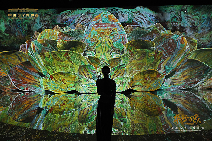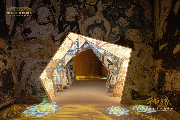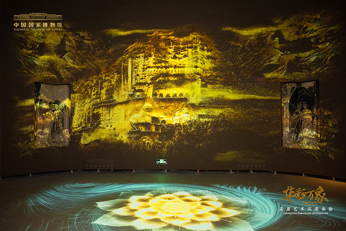 2023年12月9日,“華彩萬象——石窟藝術沉浸體驗”在中國國家博物館北側三層平臺及環廊正式對公眾開放。本次沉浸體驗展陳空間約1500平米,首次以盛開的蓮花作為造型主體設計成巨型數字裝置,藝術家們結合數字繪制、數字3D Mapping影像和AI算法技術,以當代眼光和獨特視角來表現、挖掘和闡釋克孜爾石窟、敦煌莫高窟、麥積山石窟、云岡石窟和龍門石窟的藝術風格與豐富內涵。以“菱格世界”“萬古遺珠”“東方微笑”“十方同源”“奇崛妙境”組成“藝術時空體驗區”,另有“教學互動體驗區”及“衍生藝術品區”等,共同組成全景沉浸體驗環境,石窟藝術得到全新演繹。