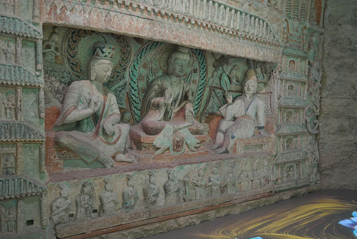 “藝術時空體驗區”分為五個板塊,每個板塊本身就是一件裝置藝術作品,表達五個石窟的各自特點。按照由西向東的石窟地理位置排序,通過沉浸式影像加以聯系。