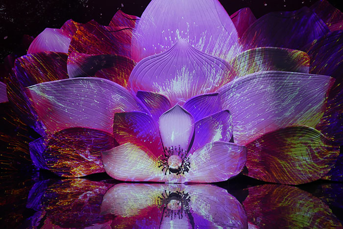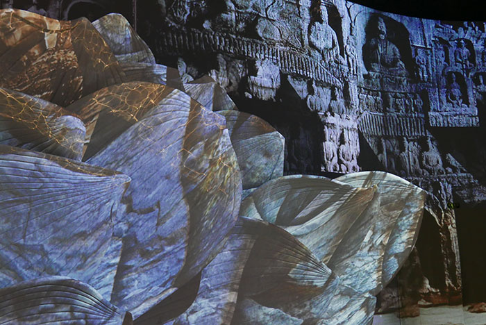 展覽借鑒了舞臺美術的表現手法,在展廳空間內設置蓮花這一實體的意象作為投影的載體。蓮花是五大石窟中都具備的元素,值得一提的是,在克孜爾石窟和敦煌莫高窟那里,蓮花多以平面圖案的形式出現;而到了云岡石窟和龍門石窟,蓮花形象已經演化成為立體的石雕,布置在石窟的藻井。它成為貫穿石窟藝術的一條線索。