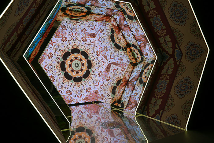 作品創意源于敦煌莫高窟。敦煌莫高窟營建時間長達千年,是不同時代審美特征和社會風貌的藝術再現。作品主體造型為六邊棱形鏡體,靈感源于多邊的藻井圖案,內容取自莫高窟壁畫中的植物紋、云氣紋、火焰紋、飛天紋、幾何紋、動物紋等紋樣,借助算法影像加以渲染,呈現其輝煌燦爛的石窟藝術風格。