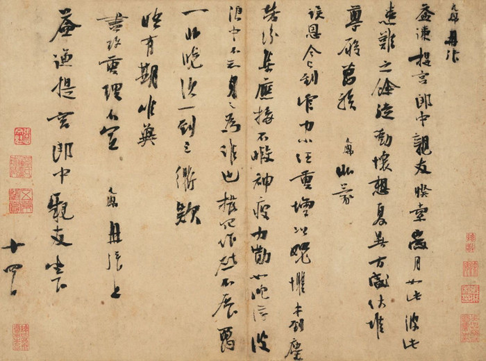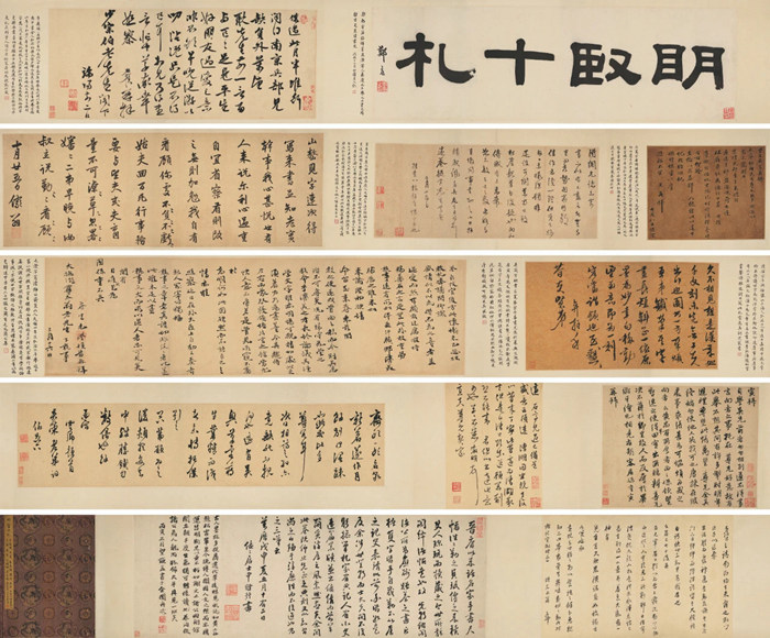 李應楨(1431-1493)、吳寬(1435-1504)、李東陽(1447-1516)、陸深(1477-1544)、吳奕(1472-1519)、毛澄(1460-1523)、唐寅(1470-1523)、文徵明(1470-1559)、莫是龍(1537-1587)、董其昌(1555-1636)書,申時行(1535-1614)、錢謙益(1582-1664)跋明賢十札 水墨紙本手卷 引首:24×77.5cm,書心:李應楨24×58.5cm、吳寬20.5×26cm、李東陽20.5×49.5cm、陸深25×71cm、吳奕22.5×41.5cm、毛澄24×87.5cm、唐寅23.5×30cm、文徵明24.4×18.5cm、莫是龍18×80.5cm、董其昌26×40cm,題跋:申時行27×58.5cm、錢謙益27×19.5cm 估價:RMB 5,000,000-8,000,000