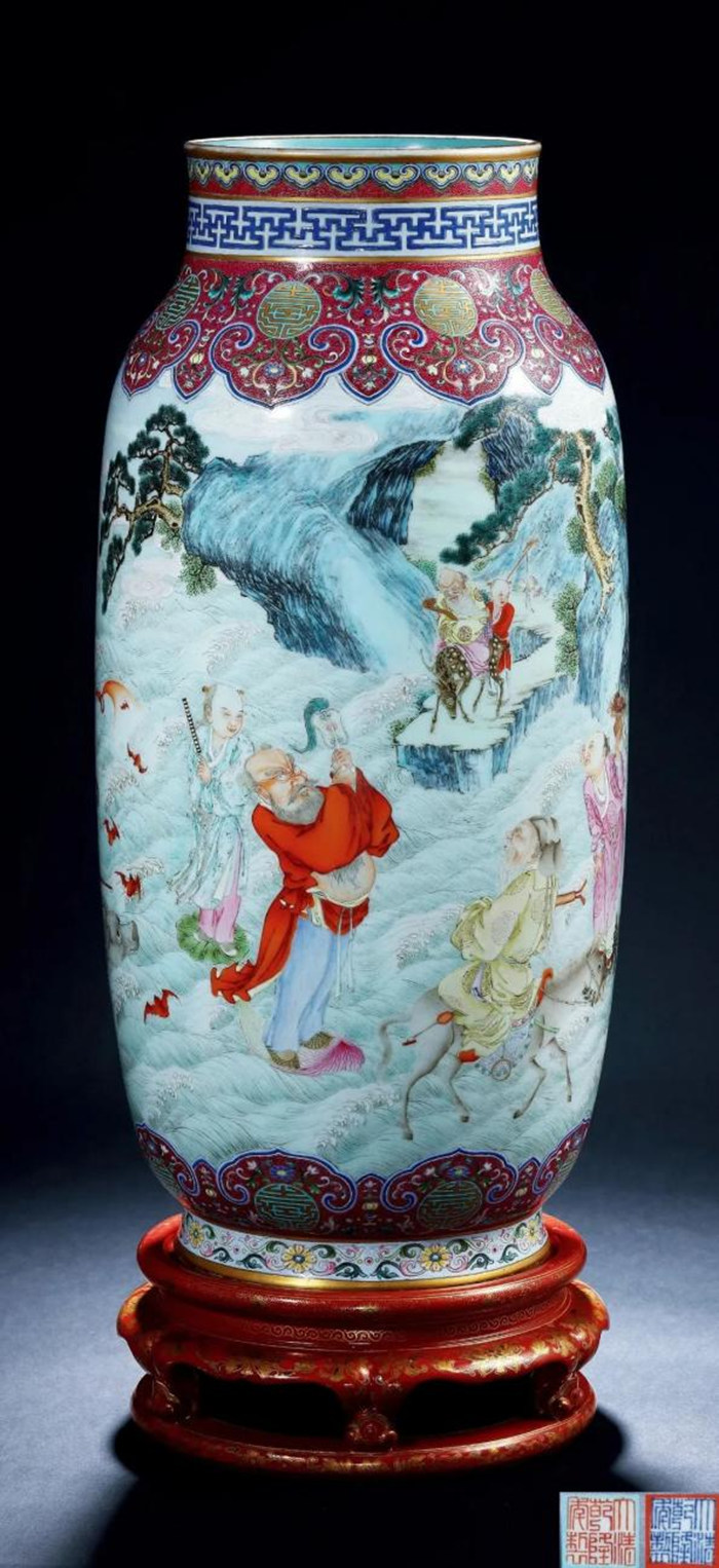 清乾隆御制洋彩胭脂紅地軋道通景“八仙慶壽”江山一統尊(連珊瑚紅描金彩瓷座)“大清乾隆年制”款 尊 H:47.5 cm,D:22cm 瓷座 H:7.9cm,D:21cm 估價待詢