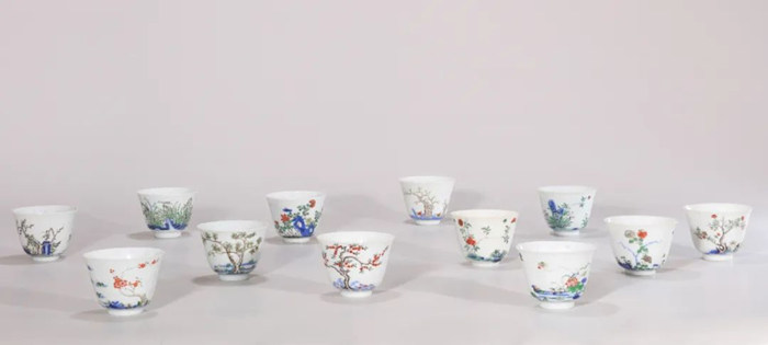 清康熙五彩十二月令花神杯“大清康熙年制”款 D:6.5-6.6cm(12只) 估價待詢 備注:瑞士玫茵堂等諸家舊藏。