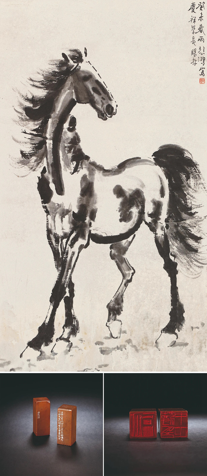 徐悲鴻 立馬 齊白石制平鈕方章一對 鏡心水墨紙本 1943年作、1932年作 畫心:90×50 cm 印章:3×3×7.4 cm×2 估價待詢