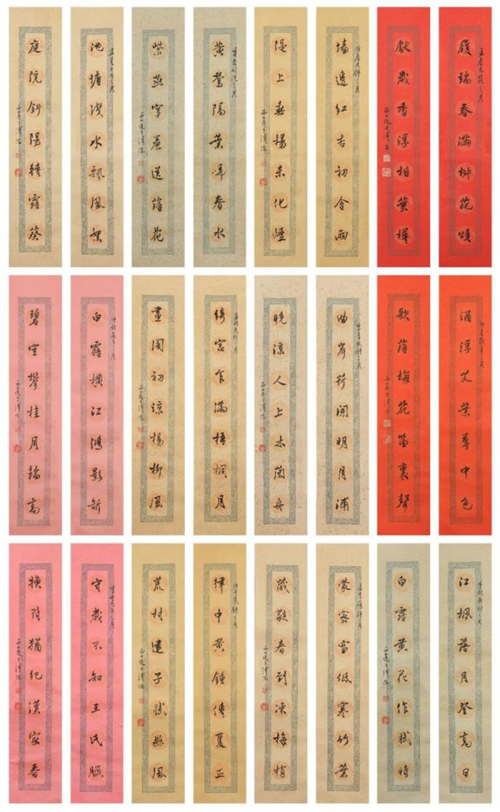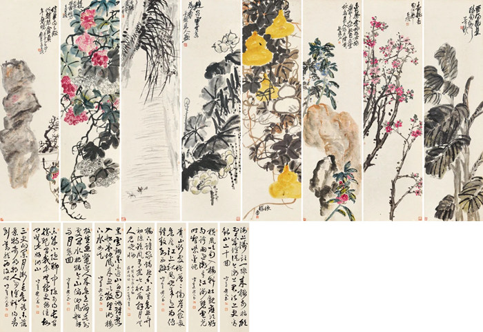 吳昌碩 日下部鳴鶴花卉書法屏風 屏風設色紙本 150.5×40.3 cm.×16 估價:RMB 6,000,000-8,000,000