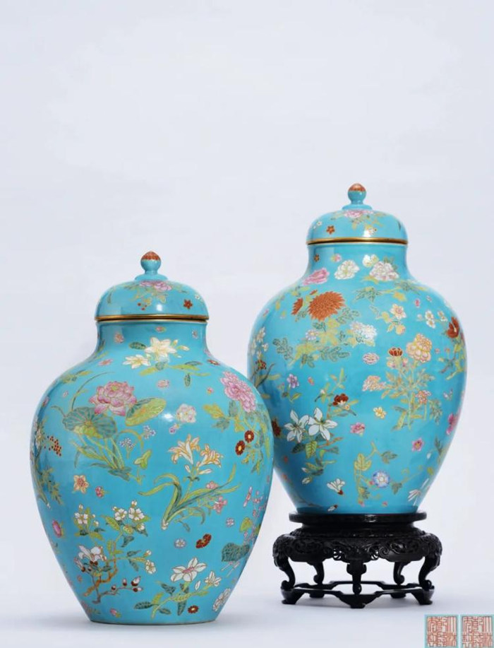 清乾隆松石綠地洋彩描金折枝四季花卉紋蓋罐成對“大清乾隆年制”款 H:41 cm 估價:RMB 13,000,000-18,000,000