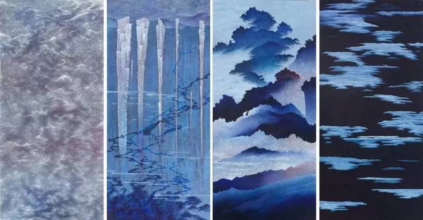 洪保峰創作作品大膽使用各種顏色,色粉有透明感,油畫有潤澤感,比如新作《絕句》,四幅,成一組春夏秋冬,以四季景象為題,融合了東西方繪畫中的那種簡約關系,讓視覺感更加透徹,畫面刪繁就簡,去掉冗雜元素,提煉出代表四季的意象景致,溫潤冰寒,顯現在四聯中。有此故,洪保峰的繪畫風格鮮明起來,漸漸形成個人語言特色。