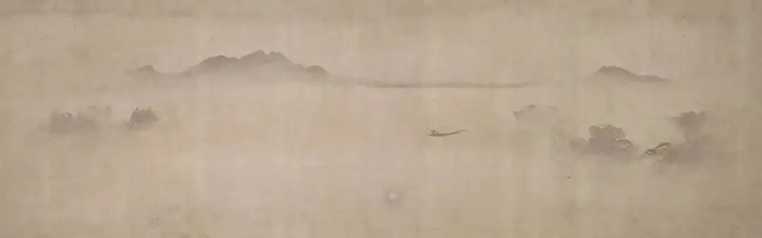 現存日本的《瀟湘八景圖》描繪了洞庭湖及其周邊地區的八種風景,《煙寺晚鐘圖》《漁村夕照圖》《遠浦歸帆圖》《平沙落雁圖》為僅存的四幅真跡。畫面空靈清寂、疏闊淡遠?!稙t湘八景圖》歷來是中國畫家熱衷的題材,其他畫家多對景物做細致刻畫,而牧溪的作品幾乎沒有一點著力刻畫的地方,樹林、居舍、遠帆、孤船、大雁如殘影疏痕地隱沒在湖光霧靄中,相比莫奈和透納逸筆草草的外光寫生作品更接近于虛無。這也難怪元代《畫繼補遺》評價牧溪的畫為“為僧房助清幽耳”。