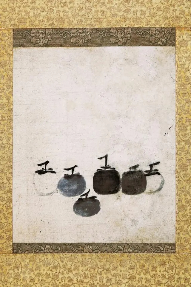 從禪畫的特點來說,一般禪僧作畫并非像文人畫那樣抒情寫意,更有通過繪畫來參悟佛理之用。佛教有“實相無相”的世界觀,通俗地理解就是佛教認為物質實體是可見可觸的存在,具有相對的穩定性,但并非一成不變,一切法幻而不真——人不必過于執著于世界的表象?!读翀D》中的實體均為柿子,由實而虛也可理解為柿子隨時間的流逝逐步脫離于實體外形而接近“空相”。
